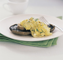 To serve, place 2 mushrooms onto each serving plate. Top with scrambled eggs. Season with salt and pepper and serve with toasted sourdough.
